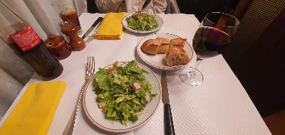 우리나라 상추? 와 같은 느낌의 채소와 호두, 양파들이 발사믹 소스와 겨자? 의 맛이 느껴지는 소스들과 버무려서 나오게 됩니다. 그리고 식전 빵은 바게트로 준비해주시네요! 식전 빵은 서유럽 어느 국가를 가든 항상 나오는 것 같습니다!