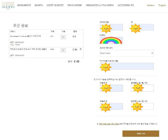 먼저 가시고자 하는 날짜를 선택해 주시고, 몇명이 가는지 선택해 주시면 됩니다. 크롬 번역이 완벽하지가 않아 헷갈리실수도 있는데요, 사진에 보이는 '완전한' 은 성인을 뜻하고 '줄인' 은 아동을 뜻합니다. 그리고 아래에 보시면 '줄넘기 예약' 이라고 되어있는 부분에 체크해주시고 두오모 쿠폴라를 입장 하시려는 시간을 '미리' 정해주셔야 합니다. 쿠폴라는 시간마다 인원을 제한해서 방문시간을 지정해야 하는데요, 저희 부부는 12시에 갔는데 후회했습니다. 줄이 엄청 깁니다. 상상이상입니다. 무조건 아침 일찍 가시는 것을 추천 드립니다.